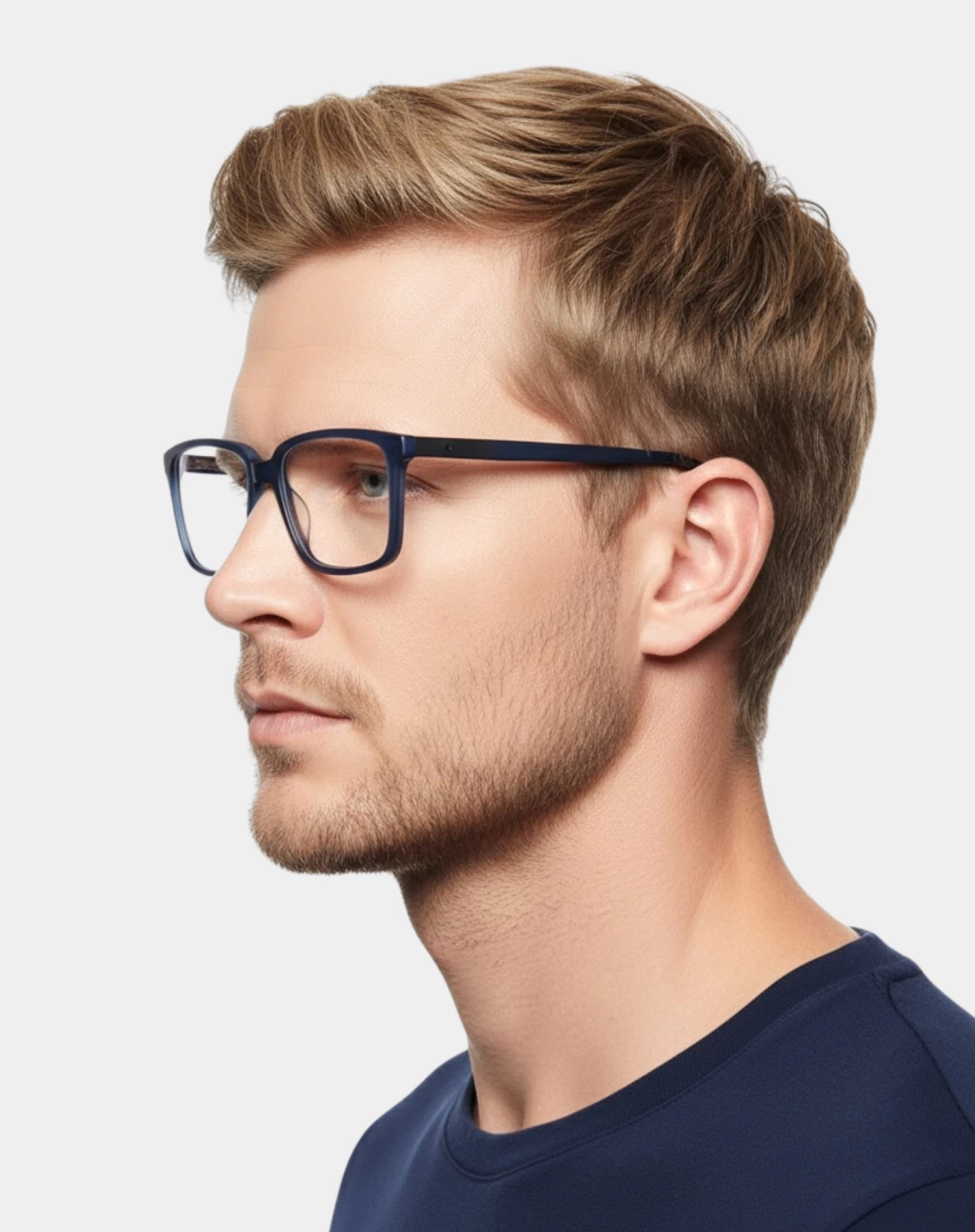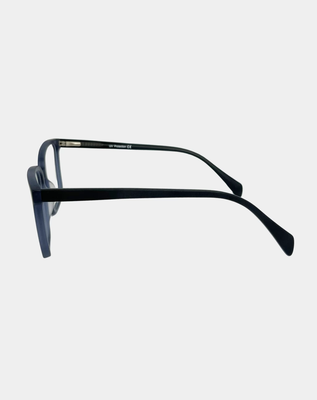 Armação de grau com design quadrado fabricado em TR90 de resistência, garantindo conforto e durabilidade ao longo do dia. Disponível na cor azul marinho fosco.