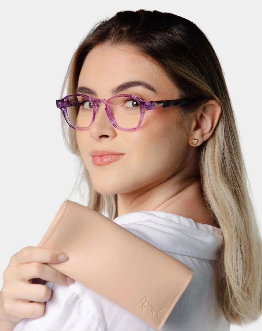 Cor: Frente ametista translucido e hastes tartaruga ametista.